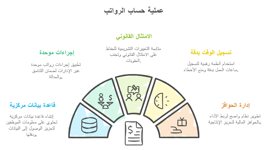 تطبيق إجراءات موحدة لحساب الرواتب في جميع الإدارات، لضمان التناسق والعدالة بين جميع الموظفين.متابعة التغييرات التشريعية