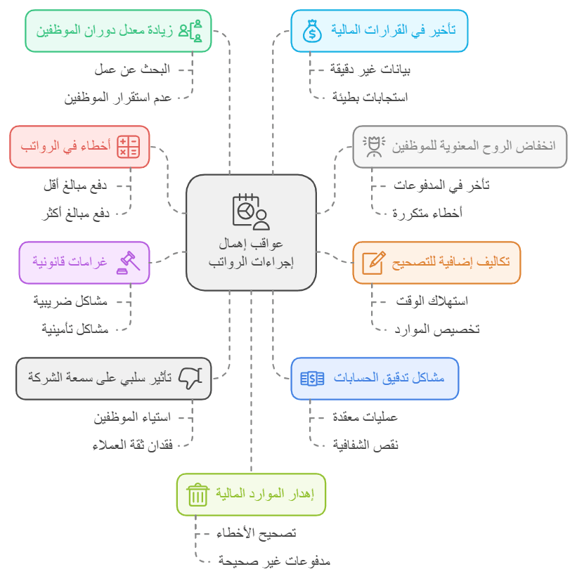 إهمال الإجراءات الصحيحة يؤدي إلى أخطاء في حساب الرواتب، مثل دفع مبالغ أقل أو أكثر من المستحقات، مما يؤثر على رضا الموظفين.انخفاض الروح المعنوية للموظفين
