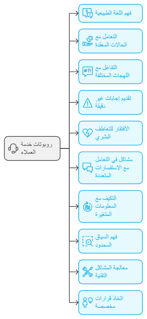 روبوتات خدمة العملاء قد تواجه صعوبة في فهم العبارات الغامضة أو اللغة غير الرسمية، مما يؤدي إلى تقديم إجابات غير دقيقة أو غير ملائمة.التعامل مع الحالات المعقدة