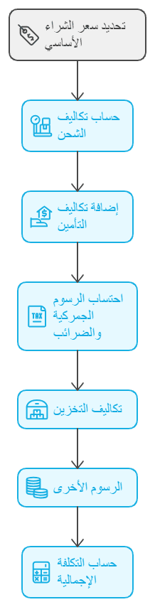 • التفاصيل: يتضمن تكاليف النقل من بلد المنشأ إلى بلد الاستيراد، بما في ذلك تكاليف الشحن البحري أو الجوي وأي رسوم إضافية مثل التأمين. يتم حساب تكاليف الشحن بناءً على الوزن والحجم والمكان.
